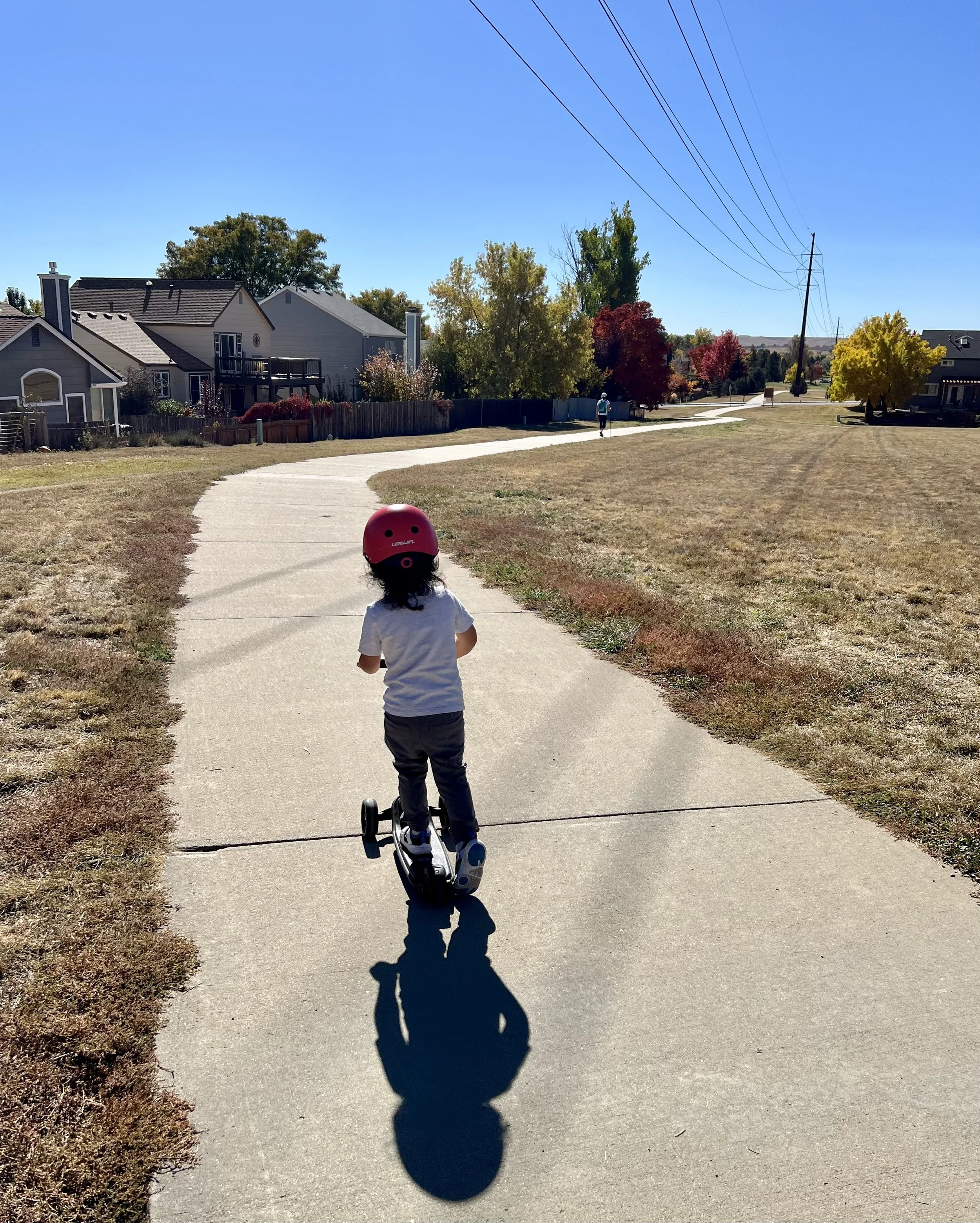 Keeping up with my child just became a whole lot harder. Once I could just plop him on a blanket in the middle of a field knowing he wouldn’t roll off because he refused to touch the grass. Then it was as easy as watching him crawl around the house as long as I stayed close enough for a quick lunge to grab something from his hands. As he walked away I was grateful that our house was not a large mansion. Running around I felt so bad for parents whose kids jump before looking. Kai is a cautious kid in many ways, thank goodness. But now that he has “mastered” the skill of the scooter, he has moved not just to a new outer circle of my orbit. He’s now moved beyond it.